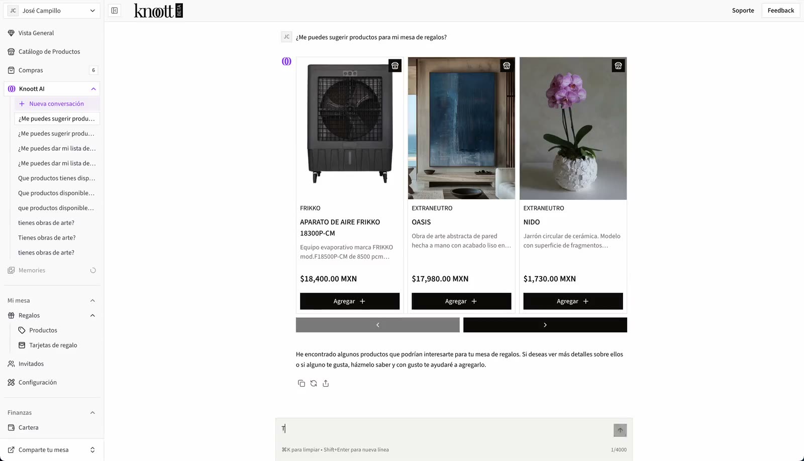 Knoott AI es tu asistente personal para planear, personalizar y optimizar tu mesa de regalos. Desde crear tarjetas hasta sugerir productos y redactar mensajes de agradecimiento, te acompaña en cada paso con inteligencia y estilo.